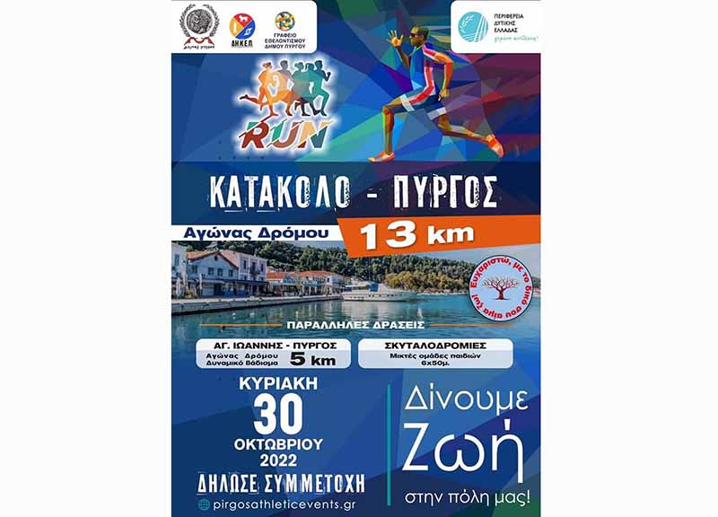 Με εκατοντάδες συμμετοχές, συνολικά από διάφορες πόλεις της Ελλάδας, θα διεξαχθεί το 1o Run Κατάκολο-Πύργος την Κυριακή 30 Οκτωβρίου. Ένα μεγάλο και πρωτόγνωρο αθλητικό γεγονός, που συνδιοργανώνει ο Δήμος Πύργου με τους Αθλητικούς Συλλόγους “Γ.Σ Άθληση Πύργου” και “Α.Σ Αίολος” σε συνεργασία με τη ΔΗΚΕΠ, το Γραφείο Εθελοντισμού, την Περιφέρεια Δυτικής Ελλάδος, καθώς και την υποστήριξη τοπικών φορέων και συλλόγων.
