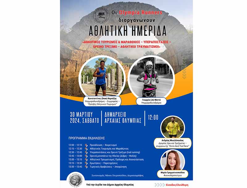 «Αθλητικός Τουρισμός & Μαραθώνιος, Υπεραποστάσεις – Ορεινό Τρέξιμο – Αθλητικοί Τραυματισμοί» είναι το θέμα της αθλητικής ημερίδας, που διοργανώνει ο Σύλλογος «Olympia Runners», με προσκεκλημένους, δυο διακεκριμένους σε διεθνές επίπεδο υπερμαραθωνοδρόμους, τον Κωνσταντίνο (Dean) Καρνάζη και την Γεωργία (Jo) Μαντά.