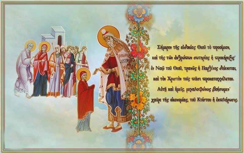 «Ἄγγελοι καί ἄνθρωποι τῆς Παρθένου τήν εἴσοδον τιμήσωμεν, ὅτι ἐν δόξῃ εἰσῆλθεν εἰς τά Ἅγια τῶν Ἁγίων. Ας την υμνούμε, ας την τιμούμε και ας εναποθέτουμε τις ελπίδες μας σε Εκείνη, ώστε να μεσιτεύσει στο Θεό για τη δική μας είσοδο στη Βασιλεία των Ουρανών. Αμήν!»