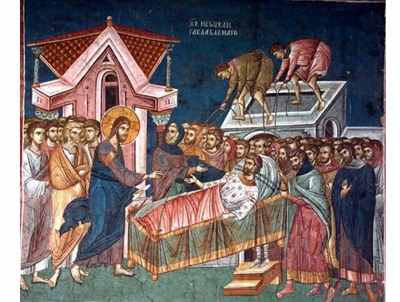 "Τω καιρώ εκείνω, εισήλθεν ο Ιησούς εις Καπερναούμ και ηκούσθη, ότι εις οικον έστι. Και ευθέως συνήχθησαν πολλοί, ώστε μηκέτι χωρείν μηδέ τα προς την θύραν, και ελάλει αυτοίς τον λόγον. Και έρχονται προς αυτόν ,παραλυτικον φέροντες, αιρόμενον υπό τεσσάρων και μη δυνάμενοι προσεγγίσαι αυτώ διά τον όχλον, απεστέγασαν την στέγην όπου ήν, και εξορύξαντες χαλώσιν τον κράββατον, εφ’ώ ο παραλυτικός κατέκειτο. Ιδών δε ο Ιησούς την πίστην αυτών, λέγει τώ παραλυτικώ. Τέκνον, αφέωνταί σοι αι αμαρτίαι σου…