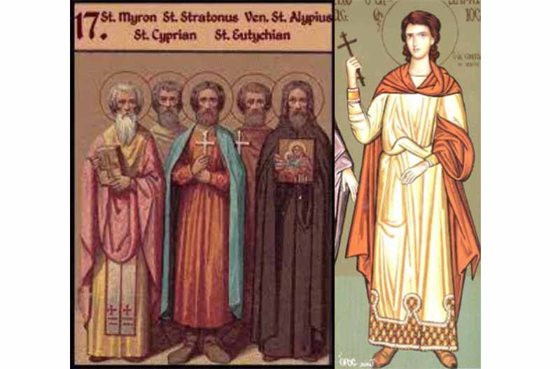 17 Αυγούστου - Άγιος Μύρων, Άγιοι Στράτων, Φίλιππος, Ευτυχιανός και Κυπριανός, Άγιος Δημήτριος ο Μοναχός από τη Σαμαρίνα της Πίνδου, Άγιοι Παύλος και Ιουλιανή και οι μαζί μ' αυτούς μαρτυρήσαντες Στρατόνικος, Κοδράτος και Ακάκιος οι δήμιοι, Άγιοι Θύρσος, Λεύκιος, Κορωνάτος και η συνοδεία τους, Σύναξη της Υπεραγίας Θεοτόκου εν τοις Αρματίου, Όσιος Αίγλων, Όσιος Ηλίας ο Νέος, Άγιος Μακάριος ο Οσιομάρτυρας, Όσιος Αλύπιος ο Εικονογράφος ο εν Σπηλαίω, Άγιος Γεώργιος ο Προσκυνητής, Άγιοι Ευτύχιος επίσκοπος Γορτύνης, Ευτυχιανός Οσιομάρτυρας και Κασσιανή