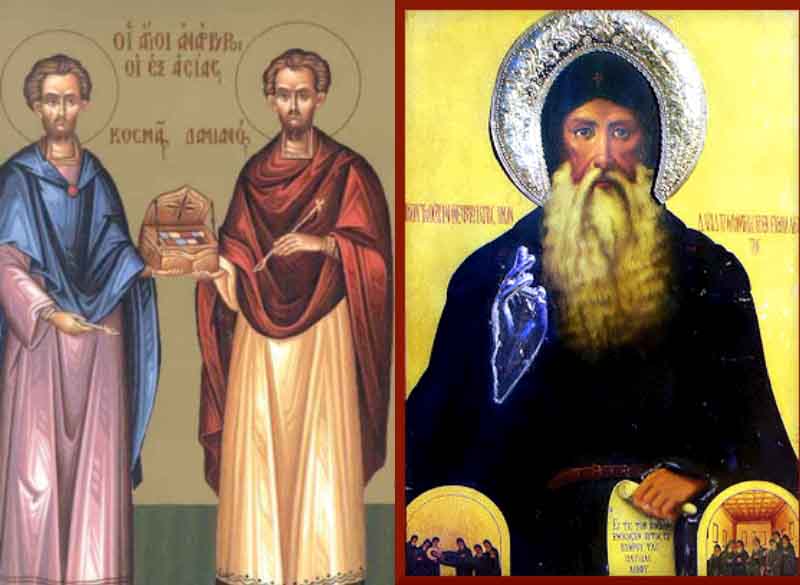 1 Νοεμβρίου - Άγιοι Κοσμάς και Δαμιανός οι Ανάργυροι και θαυματουργοί, Όσιος Δαβίδ που ασκήτευε στην Εύβοια, Αγία Ελένη η Παρθενομάρτυς από τη Σινώπη, Αγίες Κυριαίνα και Ιουλιανή, Άγιοι Καισάριος, Δάσιος, και άλλοι πέντε Μάρτυρες, Σάββας, Σαβινιανός, Αγρίππας, Αδριανός και Θωμάς το νήπιο, Άγιοι Ιωάννης ο Επίσκοπος και Ιάκωβος ο Πρεσβύτερος, Άγιος Ερμινίγγελδος, Άγιοι Ιάκωβος ο νέος Οσιομάρτυρας από την Καστοριά και οι δύο μαθητές του Ιάκωβος ο Διάκονος και Διονύσιος ο Μοναχός, Άγιος Δαβίδ ο Μέγας Κομνηνός ο νεομάρτυρας και η συνοδεία του Βασίλειος, Γεώργιος, Μανουήλ οι υιοί του και Αλέξιος ο ανεψιός του, Άγιος Δαβίδ ο Μέγας Κομνηνός ο νεομάρτυρας και η συνοδεία του Βασίλειος, Γεώργιος, Μανουήλ οι υιοί του και Αλέξιος ο ανεψιός του, Αγία Θεολήπτη, Άγιοι Κυπριανός και Ιουλιανή και Άγιος Κοσμάς του Βερχοτούρε