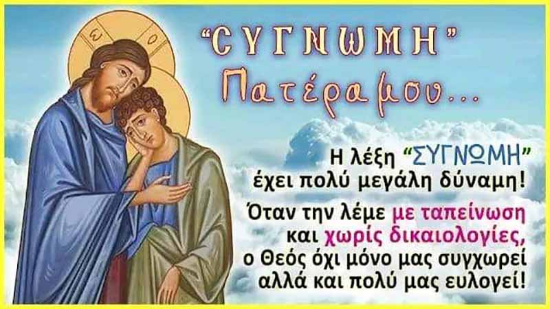 "Η Συγχώρεση κρύβει μέσα της την αγάπη! Αν δεν αγαπάς αληθινά δεν μπορείς να συγχωρέσεις. Και ο Χριστός μας καλεί συνεχώς να συγχωρούμε ο ένας τον άλλον ώστε όλοι να λάβουμε την συγχώρεση από τον Κύριο μας Ιησού Χριστό, Ο οποίος εξαιτίας της απεριόριστης αγάπης Του θυσιάστηκε για τον άνθρωπο. Συγχωρόντας ακολουθούμε το παράδειγμά Του. Η συγχώρεση είναι απαραίτητη προϋπόθεση για να εισέλθουμε στην Αγία και Μεγάλη Τεσσαρακοστή, να καθαρίσουμε τον εαυτό μας και να καλλιεργήσουμε τις αρετές καθώς θα πλησιάζουμε στο μέγα γεγονός της Αναστάσεως".