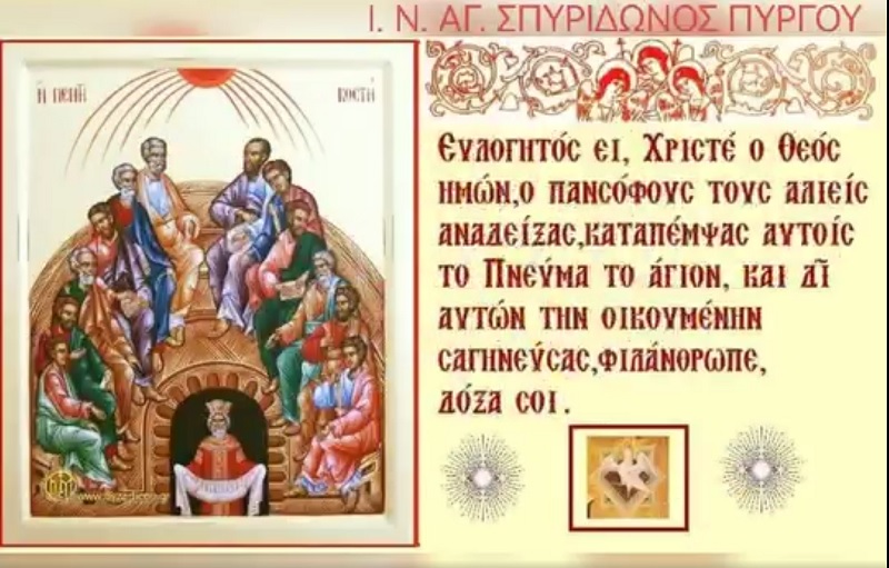 Η Εκκλησία μας πανηγυρίζει την αποστολή του Παναγίου Πνεύματος στους ανθρώπους, αφού συμπληρώθηκαν πενήντα μέρες από την Ανάσταση του Χριστού και δέκα μέρες από την άνοδο Του στους ουρανούς και της εκ δεξιών του Θεού και Πατέρα καθέδρας.