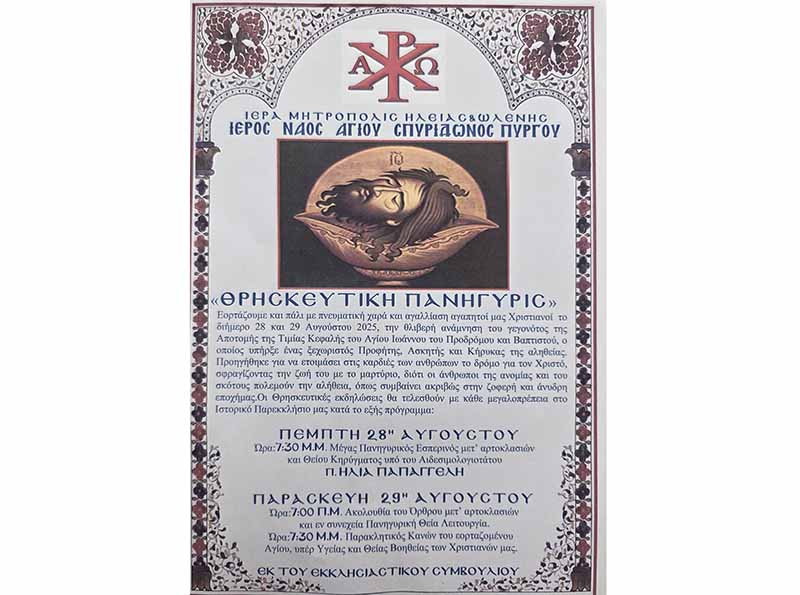 Ἐκ τῆς Ἱερᾶς Μητροπόλεως Ἠλείας ἀνακοινοῦται ὅτι τήν προσεχή Δευτέρα, 1-9-2025, θά τελεσθῆ Εὐχαριστήριος Θεία Λειτουργία εἰς τό Παρεκκλήσιον τοῦ Ἁγίου Χαραλάμπους Πύργου, Ἱερουργοῦντος τοῦ Σεβ. Μητροπολίτου μας κ.ΑΘΑΝΑΣΙΟΥ, ἀπό 7 ἕως 10 π.μ.