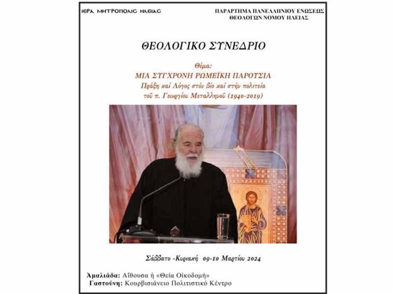 Ὅπως κάθε χρόνο, ἔτσι καί φέτος ἡ Ἱερά Μητρόπολις Ἠλείας διοργανώνει τό Θεολογικό της Συνέδριο σέ συνεργασία μέ τό Παράρτημα τῆς Πανελληνίου Ἐνώσεως Θεολόγων Νομοῦ Ἠλείας, πού θά γίνει στίς 9 καί 10 Μαρτίου 2024 στήν Ἀμαλιάδα καί στήν Γαστούνη.
