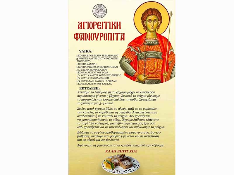 Η Ευλόγηση Φανουρόπιτων το Σάββατο 26 Αυγούστου, παραμονή της Εορτής του Νεοφανούς Αγίου Φανουρίου του Θαυματουργου προς της Ιερής Εικόνας του θα γίνει κατά τις ώρες 10:00 π.μ. έως 12:00 μ.μ και το απόγευμα 5:00 έως 6:00 μ.μ