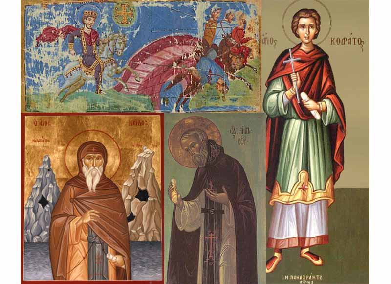 7 Μαΐου - Ανάμνηση του εν τω ουρανώ φανέντος σημείου του Τιμίου Σταυρού επί Κωνσταντίου, Άγιος Κοδράτος και οι μαζί μ' αυτόν μαρτυρήσαντες, Εύρεσις του Τιμίου Λειψάνου του Οσίου Νείλου του Νέου του Μυροβλήτη, Άγιος Ακάκιος, Άγιοι Ρουφίνος και Σατορνίνος, Όσιος Ιωάννης ο Ψυχαΐτης, Άγιος Μάξιμος, Όσιος Ταράσιος ο θαυματουργός «ὁ ἐν Λυκαονίᾳ», Μετάθεση των ιερών λειψάνων του Οσίου Ευθυμίου του Μεγάλου, Άγιος Ιουβενάλιος ο Μάρτυρας, Άγιος Φλάβιος ο Ιερομάρτυρας και των συν αυτώ Αγίων Μαρτύρων Αυγούστου και Αυγουστίνου των αυταδέλφων, Όσιος Ιωάννης και οι μαθητές αυτού, Όσιος Νείλος εκ Ρωσίας, Άγιος Αλέξιος Τοθ ο Υπερασπιστής της Ορθοδόξου Πίστεως στην Αμερική, Σύναξη της Υπεραγίας Θεοτόκου εν Λιούμπεχ Ρωσίας, Σύναξη Υπεραγίας Θεοτόκου εν Ζίροβιτς Ρωσίας και Άγιος Κύριλλος ο μάρτυρας