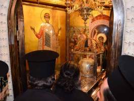 Ἀπό μία ἐπιγραφή τοῦ 1284 μ.Χ. πάνω σέ λευκόμάρμαρο, ἡ oποία βρέθηκε στή Θεσσαλονίκη δίπλα στήν πύλη τοῦ τζαμιοῦ Ἐσκί Σεράι (ναός τοῦ Προφήτη Ἠλία) πού δημοσιεύθηκε ἀπό τούς Εὐθ. Τσιγαρίδα – Κάτια Λοβέρδου-Τσιγαρίδα καί σήμερα βρίσκεται στό Ναό τοῦ Ἁγίου Γεωργίου (Ροτόντα), πληροφορούμαστε ὅτι ὁ ἀνακαινιζόμενος ναός τοῦ τρισμάκαρος «ἔχει ἐντός τόν μέγα μυροβλύτη».