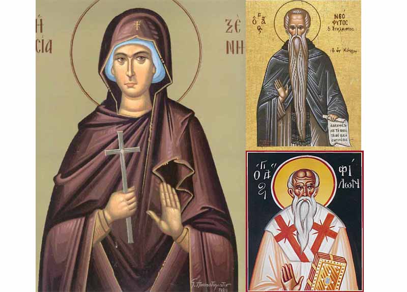 24 Ιανουαρίου - Οσίες Ξένη και οι δύο θεραπαινίδες της, Άγιοι Βαβύλας ο εν Σικελία και Αγάπιος και Τιμόθεος οι μαθητές του, Όσιος Νεόφυτος ο έγκλειστος που ασκήτευσε στην Κύπρο και Όσιος Φίλων ο Θαυματουργός Επίσκοπος Καρπασίας της Κύπρου, Άγιοι Παύλος, Παυσίριος και Θεοδοτίων οι Αυτάδελφοι, Όσιος Μακεδόνιος, Ανακομιδή Ιερών Λειψάνων του Αγίου Οσιομάρτυρος Αναστασίου του Πέρσου, Άγιοι Ερμογένης και Μάμας, Όσιος Φιλιππικός ο Πρεσβύτερος, Άγιος Βάρσιμος και τα δύο αδέλφια του, Όσιος Ζωσιμάς, Μνήμη του Aγίου Προφήτου Προδρόμου και Βαπτιστού Ιωάννου πλησίον του Ταύρου, Άγιος Φιλήμων επίσκοπος Καρπάθου, Ανάμνηση των εγκαινίων της Μεγάλης Εκκλησίας στη Θεσσαλονίκη, Ανάμνηση των εγκαινίων του Ναού του Αγίου Ζαχαρία στη Μονή της Οσίας Δομνίκης, Οσία Ξένη η Διά Χριστόν Σαλή, Άγιος Cadoc, Άγιος Ιωάννης ο Μάρτυρας εκ Καζάν, Αγία Χρυσοπλόκη και Άγιος Ελλάδιος ο Κομενταρήσιος