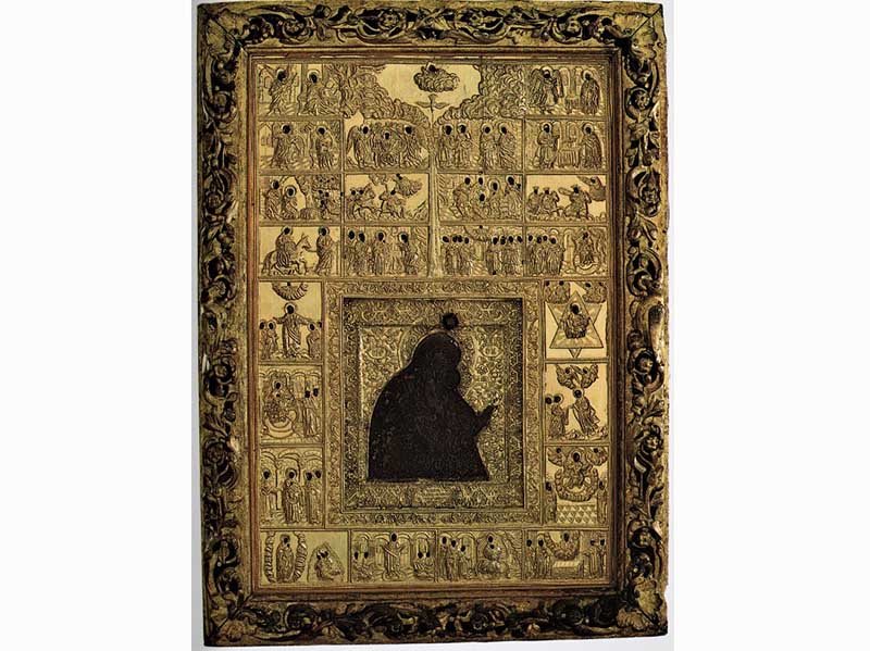 Σύμφωνα με επιγραφή που βρίσκεται σε ασημένια πλάκα στο πίσω μέρος της, η εικόνα αυτή δόθηκε ως δώρο από τον αυτοκράτορα Αλέξιο Κομνηνό στον όσιο Διονύσιο, κτίτορα της μονής κατά την επίσκεψή του στην Τραπεζούντα. Είναι δε εκείνη η εικόνα την οποία ο Πατριάρχης Σέργιος κρατούσε στα τείχη της Κωνσταντινουπόλεως κατά την πολιορκία της από τους Σκύθες το 626 μ.Χ., και μπροστά στην οποία, μετά τη θαυματουργική νίκη των Βυζαντινών, ψάλθηκε για πρώτη φορά ο Ακάθιστος Ύμνος.