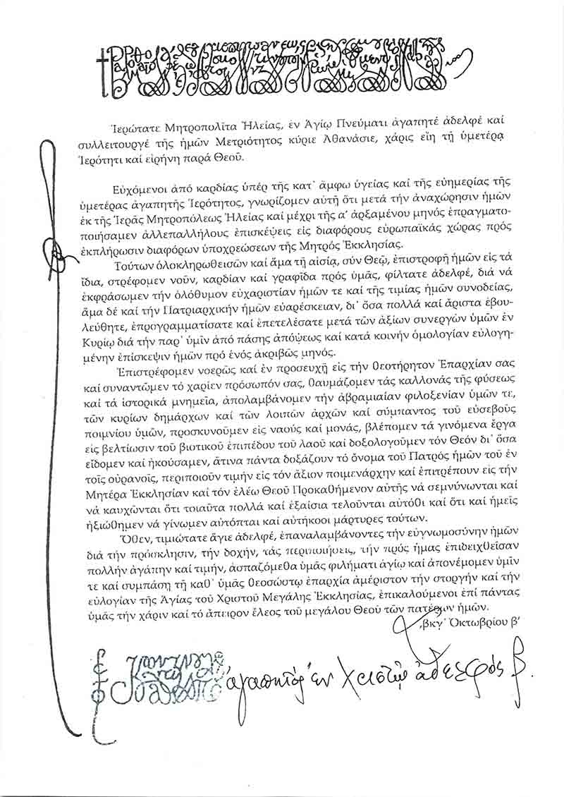 Νέας Ρώμης καί Οἰκουμενικοῦ Πατριάρχου Κυρίου κυρίου ΒΑΡΘΟΛΟΜΑΙΟΥ , δι’ἧς ἐκφράζει τίς θερμές εὐχαριστίες του πρός τόν Σεβ.Μητροπολίτην Ἠλείας κ.ΑΘΑΝΑΣΙΟΝ , τούς Ἄρχοντας καί τήν εὐσεβῆ Λαόν τῆς Ἠλείας γιά τήν θερμή ὑποδοχήν πού τοῦ ἐπιφυλάξαμε κατά τήν Ἐπίσημον παραμονήν του εἰς τήν Ἱεράν Μητρόπολιν Ἠλείας ἀπό 2 ἕως 6 Σεπτεμβρίου τρ.ἔ.