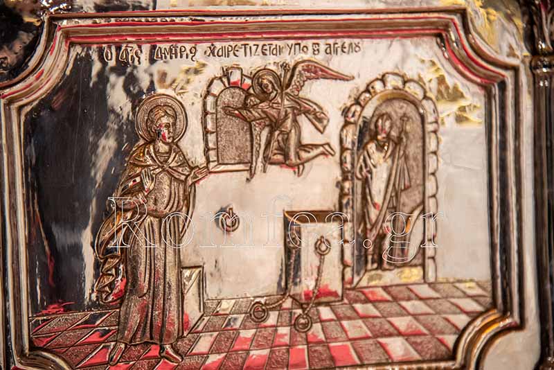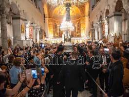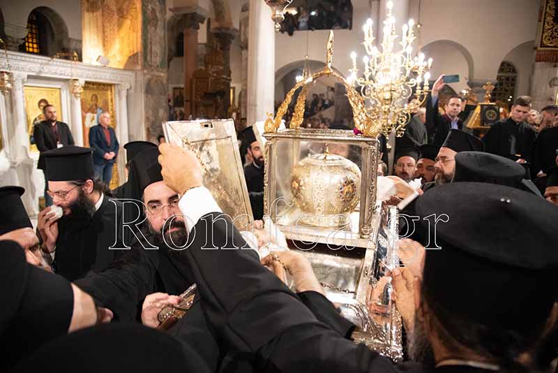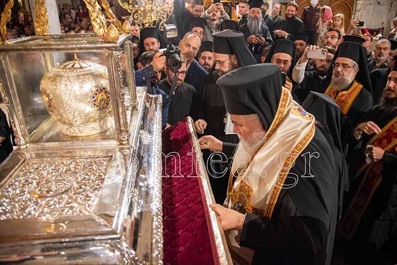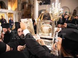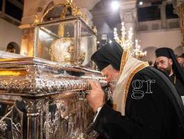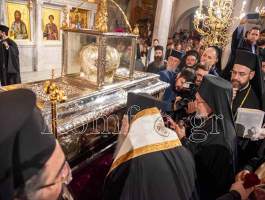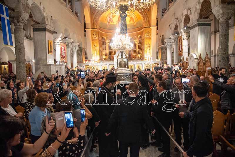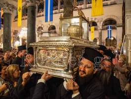 Συγκινητική ήταν η στιγμή όταν ο Σεβ. κ. Βαρνάβας ξεκλείδωσε την Λάρνακα του Μεγαλομάρτυρος και το μύρο του Αγίου ευωδίασε θαυμαστώς τον ασφυκτικά γεμάτο από κόσμο Ιερό Ναό με τους πιστούς να παρακολουθούν με δέος και ευλάβεια την Τελετή και να περιμένουν με υπομονή για να λάβουν το μύρο.