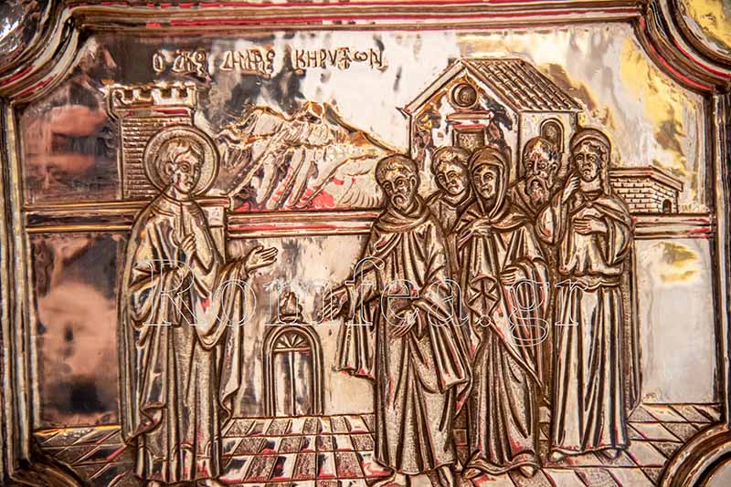 Ο Μεγαλομάρτυρας Δημήτριος λαμβάνοντας τις ικεσίες των προστρεχόντων σε αυτόν, δίνει τη δική του ευλογία με την από αιώνες προσφορά του θαυματουργού του Μύρου.