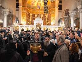 Στο τέλος οι Ιερείς διένειμαν το μύρο σε όλους τους συμμετέχοντες της Ακολουθίας του Καθαγιασμού, μέσα και έξω από τον εμβληματικό και ιστορικό Ιερό Ναό!