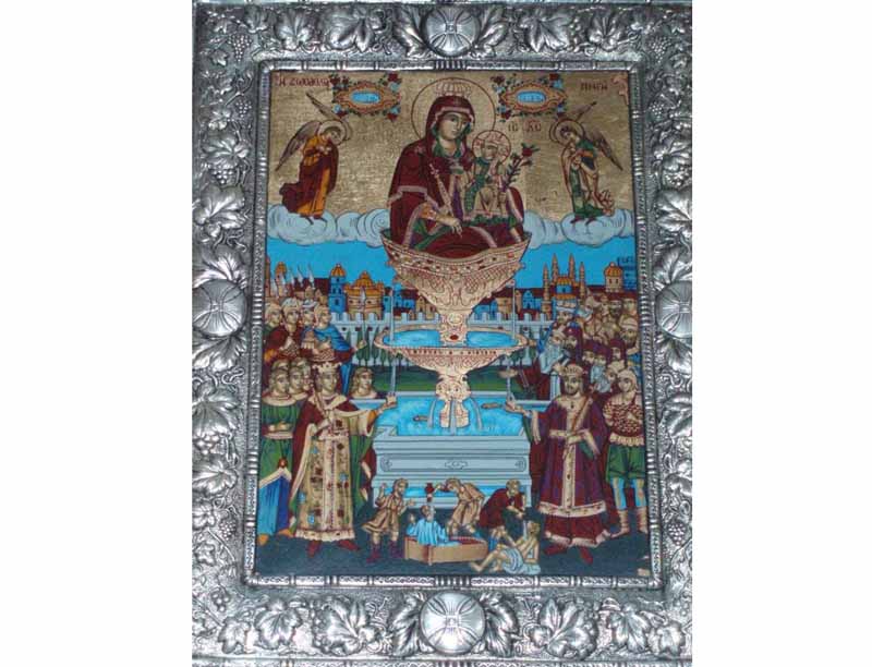 «Χαίροις η ζωηφόρος Πηγή, η αενάως αναβλύζουσα χάριτας, η βρύσις των ιαμάτων, η πάσαν νόσων ισχύν, ασθενή και φαύλην απελέγχουσα. Τυφλών η ανάβλεψις, και λεπρών θεία κάθαρσις. Σθένος αρρώστων, παρειμένων ανόρθωσις, η πηγάζουσα νοσημάτων παν φάρμακον, άπασι τοις προστρέχουσι, πιστώς τω τεμένει σου, μέγα κοινόν ιατρειον, άμισθον όντως και έτοιμον, Χριστού Μήτερ Λόγου, του πηγάζοντος τω κόσμω, το μέγα έλεος».