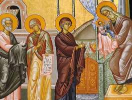 Σαράντα ημέρες μετά την Θεία Γέννηση, η Θεομήτωρ μεταβαίνει στο ναό. ’’Και όταν σύμφωνα με το νόμο του Μωυσή συμπληρώθηκαν οι ημέρες για τον καθαρισμό της Μητέρας , του Παιδίου και του Δίκαιου Ιωσήφ ανέβασαν αυτόν στα Ιεροσόλυμα για να τον παρουσιάσουν και τον αφιερώσουν στον Κύριο.’’