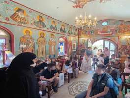 Τελευταία στάση η Ιερά Μονή Κοιμήσεως της Θεοτόκου στο Κρυονέρι Αμαλιάδας, όπου ο Πατέρας Γερμανός άνοιξε της «αγκαλιά» του μοναστηριού αλλά και την δική του για να δεχτεί και να φιλοξενήσει μικρούς και μεγάλους. Τα κεράσματα πλούσια, όλα από τα χέρια του ετοιμασμένα. Καφέδες και χυμοί για να ξαποστάσουν οι μεγάλοι, λαχταριστό παγωτό για να δροσιστούν οι μικροί. Κι όταν τα χεράκια δροσίστηκα και αναπαύτηκαν, απλώθηκαν να πάρουν τα ενθύμια και τις ευλογίες τόσο από την «κυρία» τους, Γερόντισσα Μακαρία όσο και από τον Πατέρα Γερμανό.
