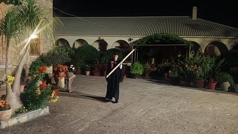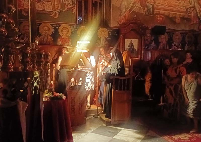 Στο Ψαλτήρι η Οσιοτάτη Καθηγουμένη της Ιεράς Μονής, Μακαρία Μοναχή, πλαισιωμένη από καλλίφωνες ψάλτριες, με την μοναδικότατη μελωδική, γλυκιά φωνή της, έψαλε το Απολυτίκιο του Αγίου, τα Τροπάρια και τους Ύμνους, ενώ η καμπάνα και το σήμαντρο ανέβαζαν όλη την κατάνυξη και την ευχαριστία στο Θρόνο του Θεού!