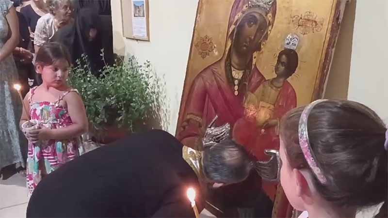 Η Ιερή Εικόνα τοποθετείται δίπλα από την είσοδο, επάνω σε πάλλευκο κεντητό σεντόνι. Κεράκια ανάβουν και η παράκληση «Θεοτόκε Παρθένε, σώσον ημάς» ακούγεται από τα χείλη όλων.