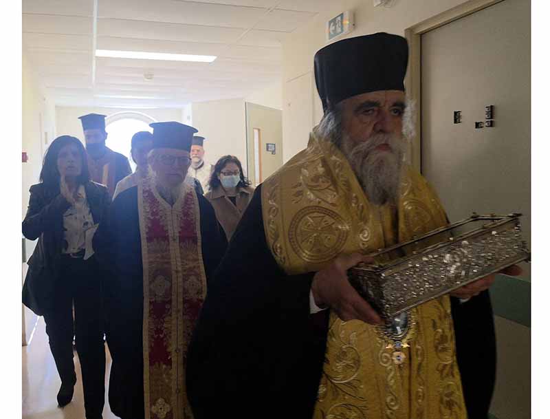 Στην υποδοχή παρέστη ο Διοικητής του Νοσηλευτικού Ιδρύματος κ. Σπύρος Πολίτης, ο οποίος εξέφρασε τις θερμές ευχαριστίες του για την εξαιρετική αυτή ευλογία και τιμή που επεφύλαξε η τοπική μας Εκκλησία στο νοσηλευτικό ίδρυμα, καθώς και η Διοικήτρια του Νοσοκομείου Κρεστένων κ. Αριστέα Παπαδοπούλου, καθώς επίσης στελέχη της Διοικήσεως, μέλη του Ιατρικού και Νοσηλευτικού προσωπικού και συνοδοί των Ασθενούντων.