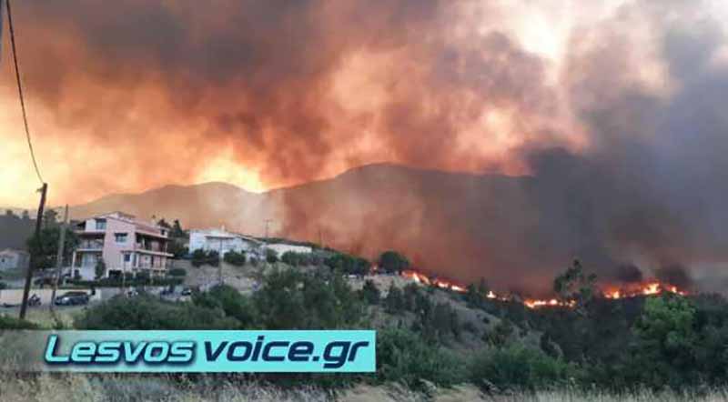 Στο νησί πνέουν ισχυροί άνεμοι, ενώ πυροσβέστες και κάτοικοι δίνουν μάχη για να προστατεύσουν τα σπίτια από τις φλόγες, με την πόλη να «κυκλώνεται» από τις φλόγες.
