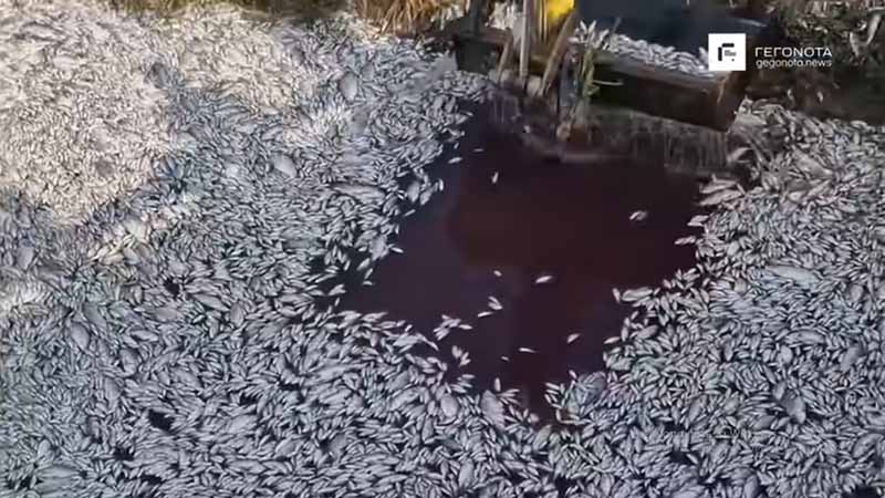 Όπως φαίνεται από τα εναέρια πλάνα με drone που κατέγραψαν τα gegonota.news, τα νεκρά ψάρια φθάνουν σε μήκος περίπου 500 μέτρων και το πλέγμα με δυσκολία πλέον τα συγκρατεί.