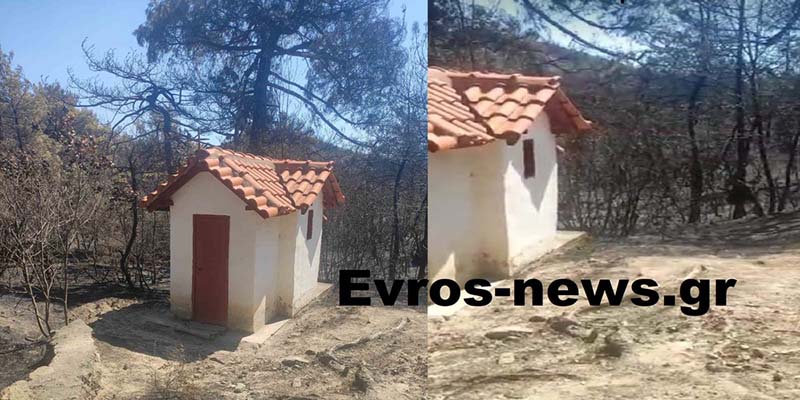 Άθικτο το εκκλησάκι του Αγίου Ραφαήλ στην «καρδιά» του δάσους στη Δαδιά, αν και γύρω του όλα έχουν καεί από την καταστροφική πυρκαγιά.