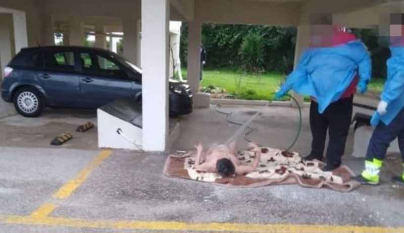 Αποτροπιασμό προκαλεί μια φωτογραφία από τον Ωρωπό που κάνει τον γύρο των μέσων κοινωνικής δικτύωσης, στην οποία φαίνεται μια γυμνή γυναίκα ξαπλωμένη πάνω σε κουβέρτα, χωρίς τα ρούχα της, την οποία νοσηλευτικό πλήρωμα ασθενοφόρου πλένει με λάστιχο σε πυλωτή πολυκατοικίας.