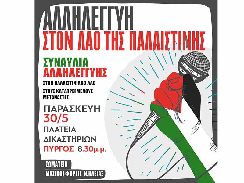 Τα σωματεία Δημόσιου και Ιδιωτικού Τομέα σας προσκαλούν στη Συναυλία Αλληλεγγύης στον Παλαιστινιακό Λαό που διοργανώνουν την Παρασκευή 30/05 και ώρα 20:30 στην πλατεία Δικαστηρίων.