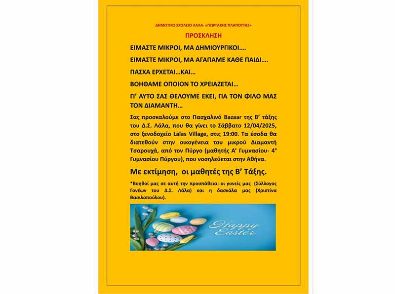 Όταν η δασκάλα της Β΄Δημοτικού του Δημοτικού Σχολείου Λάλα ρώτησε τα παιδάκια της τι θα ήθελαν να κάνουν όλοι μαζί για Πάσχα, η απάντηση ήρθε σύσσωμη και συγκλονιστική: «Να βοηθήσουμε παιδάκια!» Η επιλογή ήταν εύκολη. Ο μικρός Διαμαντής Τσαρουχάς μαθητής Α΄Γυμνασίου στο 4ο Γυμνάσιο Πύργου.