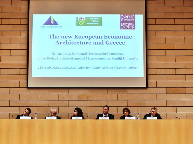 Με μεγάλη επιτυχία πραγματοποιήθηκε την Παρασκευή 4 Δεκεμβρίου 2015 η εκδήλωση που συνδιοργάνωσαν το Ινστιτούτο Δημοκρατίας Κωνσταντίνος Καραμανλής και το Julian Hodge Institute of Applied Macroeconomics του Πανεπιστημίου του Cardiff με θέμα «Η Νέα Ευρωπαϊκή Οικονομική Αρχιτεκτονική και η Ελλάδα».