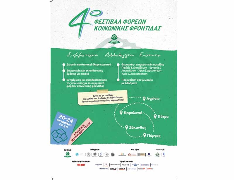 Έρχεται το 4ο Φεστιβάλ Φορέων Κοινωνικής Φροντίδας με κεντρικό μήνυμα: «Συμμετοχή, Αλληλεγγύη, Ενότητα» – «Ταξιδεύει» σε Αγρίνιο, Πύργο, Ζάκυνθο, Κεφαλονιά και Πάτρα