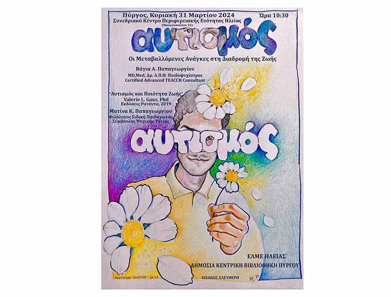 Στο πλαίσιο της Παγκόσμιας Ημέρας ενημέρωσης για τον Αυτισμό η ΕΛΜΕ Ηλείας και η Δημόσια Κεντρική Βιβλιοθήκη Πύργου διοργανώνει εκδήλωση την Κυριακή 31 Μαρτίου 2024 σε συνεργασία με την Νικολία Μωραΐτη, εκπαιδευτικό ΠΕ05.