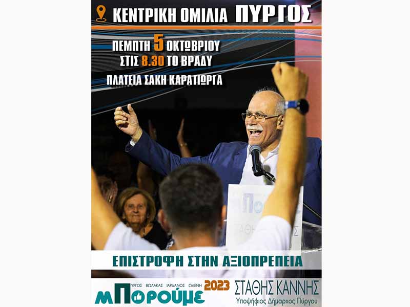 Μεγαλειώδης ήταν η κεντρική προεκλογική συγκέντρωση της ανεξάρτητης δημοτικής παράταξης «ΜΠΟΡΟΥΜΕ». Σύσσωμοι οι δημότες του Δήμου Πύργου έδωσαν ισχυρή εντολή το βράδυ της Πέμπτης 5 Οκτωβρίου στον Στάθη Καννή. Το βροντερό παρών των πολιτών έστειλε ξεκάθαρο μήνυμα νίκης και αισιοδοξίας για το αύριο του Δήμου Πύργου.