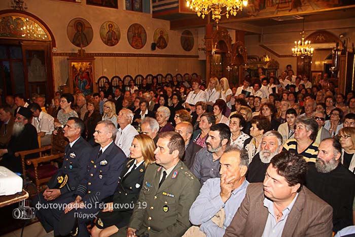 Η αξιόλογη αυτή εκδήλωση έκλεισε με το κοντάκιον «Τη Υπερμάχω» και την ανάκρουση του Εθνικού Ύμνου, ενώ παρέστησαν ο Θεοφιλέστατος Επίσκοπος Ωλένης κ.κ Αθανάσιος, ο οποίος ευλόγησε και συνεχάρη το Εκκλησιαστικό Συμβούλιο του Ιερού Ναού για την λαμπρή αυτή Ιστορική και Πολιτιστική εκδήλωση, καθώς επίσης ο Γενικός Αρχιερατικός Επίτροπος της Ιεράς Μητροπόλεώς μας π. Ηλίας Παπαγγελής με χορεία Ιερέων, ο εντεταλμένος Σύμβουλος του Δήμου Πύργου κ. Νικόλαος Βλαχαντώνης , ο επικεφαλής της μείζονος πλειοψηφίας του Δημοτικού Συμβουλίου Πύργου κ. Τάκης Αντωνακόπουλος, οι Δημοτικοί Σύμβουλοι κ. Χάρης Μιχαλακόπουλος και κ. Θεόδωρος Κόρδας, ο Διοικητής της Σ.Ε.Τ.Η.Λ. Πύργου Αντισυνταγματάρχης κ. Κωνσταντίνος Σμυρνής και η Λοχίας ΕΠΟΠ κ. Ευγενία Χριστοπούλου, ο Διοικητής της 117 Πτέρυγος Μάχης Ανδραβίδος Ταξίαρχος κ. Νικόλαος Κωσταβάρας , ο Διοικητής του Κ.Ε.Α.Τ. Ανδραβίδος Σμήναρχος κ. Δημήτριος Σιδερίδης, ο εκπρόσωπος της Πυροσβεστικής Υπηρεσίας Πύργου Αντιπύραρχος κ. Κώστας Σπυρόπουλος, ο Πρόεδρος του παραρτήματος της Ένωσης Αποστράτων Αξιωματικών Ναυτικού (Ε.Α.Α.Ν. Ηλείας) κ. Ζώης Υφαντής, ο Πρόεδρος του παραρτήματος της Ένωσης Αποστράτων Αξιωματικών Στρατού κ. Γεώργιος Σταματόπουλος, ο Πρόεδρος του Ιατρικού Συλλόγου Πύργου και Ολυμπίας κ. Ευάγγελος Παπαγεωργίου, ο πρόεδρος της Φιλαρμονικής Εταιρίας Πύργου «ΑΠΟΛΛΩΝ» κ. Αθανάσιος Δασκόπουλος, ο πρόεδρος του Νομαρχιακού Συλλόγου Ατόμων με Ειδικές Ανάγκες κ. Ιωάννης Παπαδάτος, ο πρόεδρος του Λαογραφικού Ομίλου Πύργου «ΗΛΕΙΩΝ ΠΑΡΑΔΟΣΙΣ» κ. Κώστας Αθανασόπουλος, ο Πρόεδρος του παρατήματος της Εθνικής Δράσης Ηλείας κ. Νικόλαος Ζέζας, η Πρόεδρος του τοπικού περιφερειακού τμήματος του Ε.Ε.Σ. κ. Τζένη Τσεπενέκα, η πρόεδρος του Λυκείου Ελληνίδων Πύργου κ. Τούλα Καλαμπόκα, η πρόεδρος του Συλλόγου Ποντίων Νομού Ηλείας κ. Μαριάνθη Χιδήρογλου, η Διευθύντρια του Σταθμού Αιμοδοσίας του Νοσοκομείου Πύργου κ. Κωνσταντίνα Παννέτα, η πρόεδρος του Πολιτιστικού Συλλόγου «ΠΥΡΓΟΣ ΟΛΟΙ ΜΑΖΙ» κ. Λόπη Νικολοπούλου, ο εκπρόσωπος της Πολιτιστικής Λέσχης Τραπεζικών Υπαλλήλων Πύργου κ. Ανδρέας Γιατράς, ο ποιητής κ. Σάκης Γεωργακόπουλος και πλήθος κόσμου.