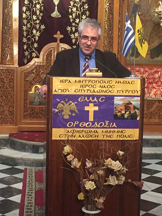 Ομιλητής στην εκδήλωση αυτή ήταν ο εκ Πύργου καταγόμενος κ. Γεώργιος Μιχαλακόπουλος, Αναπληρωτής Καθηγητής στο Ιόνιο Πανεπιστήμιο Κέρκυρας με θέμα: «Η ΑΛΩΣΗ ΤΗΣ ΚΩΝΣΤΑΝΤΙΝΟΥΠΟΛΗΣ ΩΣ ΚΑΘΡΕΠΤΗΣ ΤΗΣ ΙΔΙΟΣΥΣΤΑΣΙΑΣ ΤΩΝ ΤΟΥΡΚΩΝ». Στην αρχή της εμπεριστατωμένης αυτής ομιλίας του, ο εκλεκτός ομιλητής παρουσίασε στο πυκνό ακροατήριο τα κύρια αίτια της παρακμής της Βυζαντινής Αυτοκρατορίας (Ρωμανίας), τα οποία έστρωσαν το δρόμο για την πτώση της και τις ομοιότητες που αυτά παρουσιάζουν με της σημερινές συνθήκες, επισημαίνοντας την σημασία της αντίστασης στις «μικρές καθημερινές και ύπουλες αλώσεις» που όλοι υφιστάμεθα μαζί με την πατρίδα μας. Ειδικότερα δε τόνισε την συμβολική σημασία της Άλωσης ως προοίμιο της δημιουργίας πνεύματος αντίστασης που έφερε την Επανάσταση του 1821 αλλά και ως σηματοδότης των ΟΧΙ του Ελληνισμού. Καταλήγοντας δε τόνισε χαρακτηριστικά ότι η Άλωση και οι μετέπειτα εξελίξεις μας διδάσκουν ότι τελικά επιβιώσαμε μέχρι σήμερα, χάρη στη συσπείρωσή μας μέσα στην αυθεντικότητα της Ορθοδόξου Εκκλησίας μας, που είναι Σταυροαναστάσιμη και που μας θυμίζει ότι μετά την Σταύρωση του Γένους ακολουθεί η Ανάσταση.