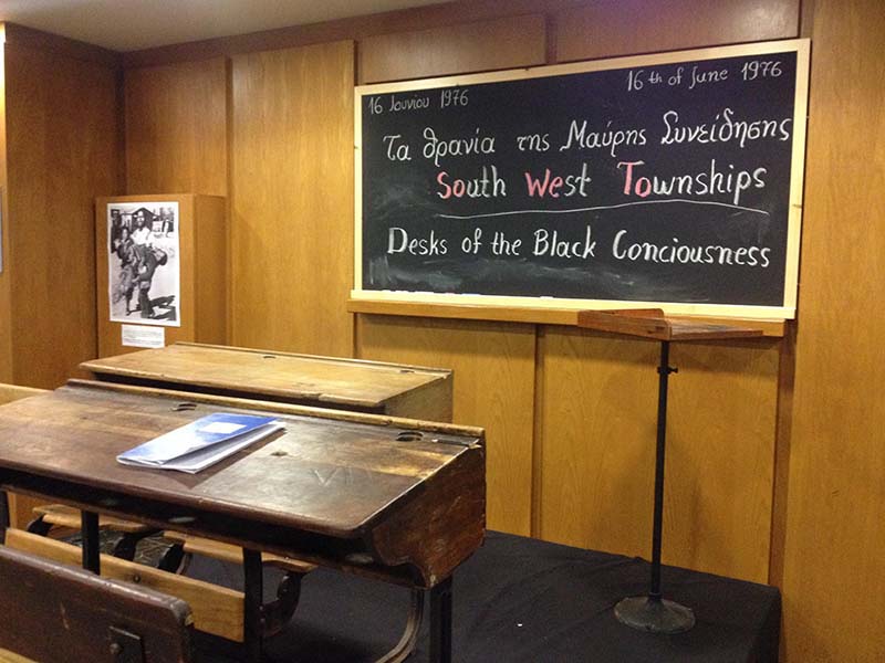 Δύο ξύλινα θρανία από το σχολείο του Σοβέτο, οι μαθητές του οποίου εξεγέρθηκαν το 1976 εναντιωμένοι στα κλιμακούμενα νομοθετήματα του καθεστώτος του Απαρτχάιντ που επέβαλαν μια άνιση εκπαίδευση σε βάρος των μαύρων της Νότιας Αφρικής, αποτελούν τα κύρια εκθέματα μιας εγκατάστασης, η οποία καλεί τον επισκέπτη να κατανοήσει την πολιτική στάση και την εξέγερση όσων στερούνται βασικών ανθρωπίνων δικαιωμάτων. Η έκθεση, που φιλοξενείται στο φουαγιέ του Συνεδριακού Κέντρου της Περιφερειακής Ενότητας Ηλείας, στον Πύργο, είναι μια πρωτοβουλία του Διεθνούς Φεστιβάλ Κινηματογράφου Ολυμπίας για Παιδιά και Νέους, την οποία επιμελήθηκε ο εκπαιδευτικός- μουσειολόγος Βασίλης Μπάρκουλας, η