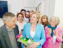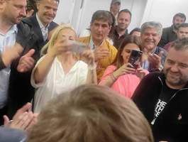 Η ίδια, εμφανώς συγκινημένη, έχοντας διαρκώς στο πλευρό της τον γιο της, τον σύζυγό της, τους γονείς της, τους συνεργάτες της, πνίγηκε στις αγκαλιές του κόσμου και δέχθηκε με χαμόγελο ευχές και ανθοδέσμες που δεν σταμάτησαν να της προσφέρουν.