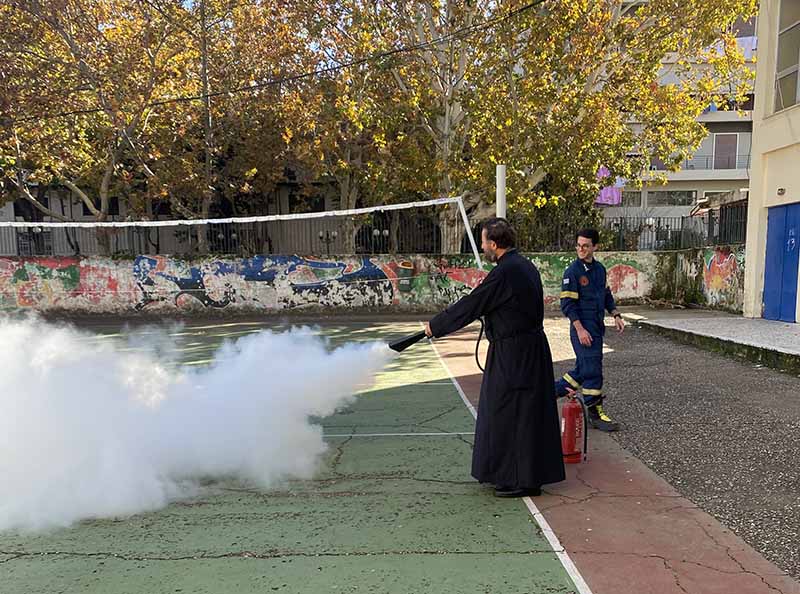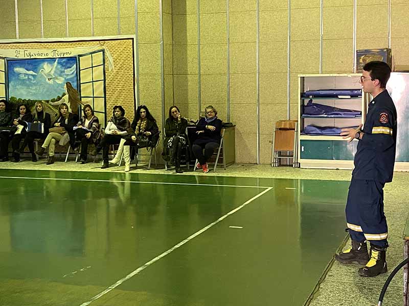 Ο Ανθυποπυραγός κ. Αποσταλάκης Μάριος παρουσίασε τα προληπτικά μέτρα για την αποφυγή πυρκαγιών, την αντιμετώπισή τους, τα είδη των πυροσβεστήρων και τη χρήση τους καθώς και τις ενέργειες σε περίπτωση σεισμού. Δόθηκαν οδηγίες και συμβουλές για τον σωστό τρόπο εκκένωσης του σχολείου από τους μαθητές και τους εκπαιδευτικούς σε περίπτωση εκδήλωσης πυρκαγιάς αλλά και για άλλες περιπτώσεις έκτακτης ανάγκης. Ακολούθησε επίδειξη της σωστής χρήσης των πυροσβεστήρων για την κατάσβεση πυρκαγιάς και δόθηκε η ευκαιρία στους εκπαιδευτικούς των σχολείων να χρησιμοποιήσουν τους πυροσβεστήρες στον προαύλιο χώρο.