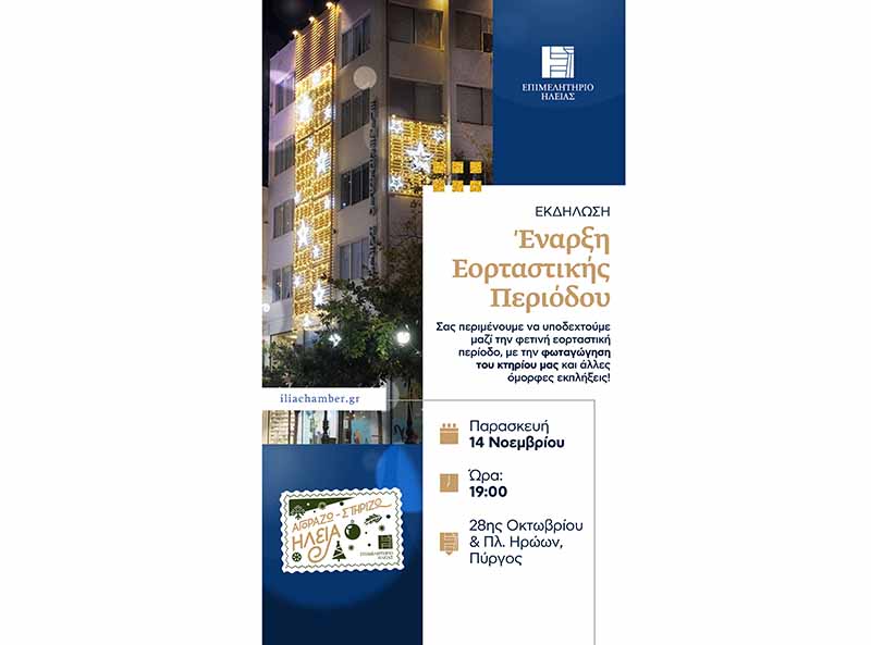 Το Επιμελητήριο Ηλείας, με στόχο την ενίσχυση της τοπικής αγοράς και τη δημιουργία θετικού κλίματος ενόψει των εορτών, προσκαλεί τους πολίτες και τους επαγγελματίες του Πύργου στην εκδήλωση φωταγώγησης του Χριστουγεννιάτικου διάκοσμου του κτιρίου του, την Παρασκευή 14 Νοεμβρίου 2025, στις 19:00, στην πλατεία έμπροσθεν του Επιμελητηρίου.