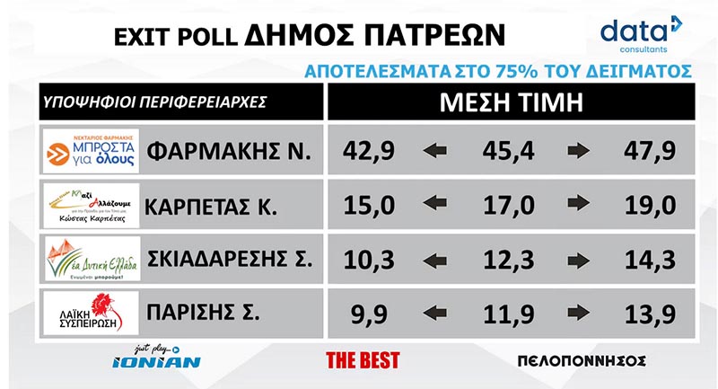 Tα αποτελέσματα του Exit poll, για την Περιφέρεια Δυτικής Ελλάδας που αφορά στο εκλογικό σώμα στην Πάτρα με αναγωγή σε όλες τις Περιφερειακές Ενότητες, από την εταιρεία δημοσκοπήσεων DATA Consultants.