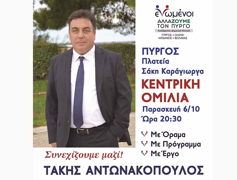 «Ενωμένοι αλλάζουμε τον Πύργο»: Την Παρασκευή (6/10) η ομιλία του Τάκη Αντωνακόπουλου στην κεντρική πλατεία Πύργου