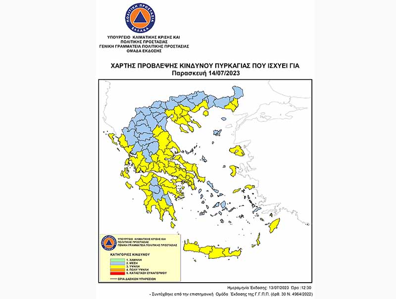Σύμφωνα με την πρόβλεψη της Γενικής Γραμματείας Πολιτικής Προστασίας οι Π.Ε. Αχαΐας, Ηλείας, Αιτωλοακαρνανίας, θα βρίσκονται στην κατηγορία 3 (υψηλή) σε σχέση με τον κίνδυνο πρόκλησης πυρκαγιάς, την Παρασκευή 14 Ιουλίου 2023, όπως φαίνεται στον επισυναπτόμενο ημερήσιο Χάρτη Πρόβλεψης Κινδύνου Πυρκαγιάς.