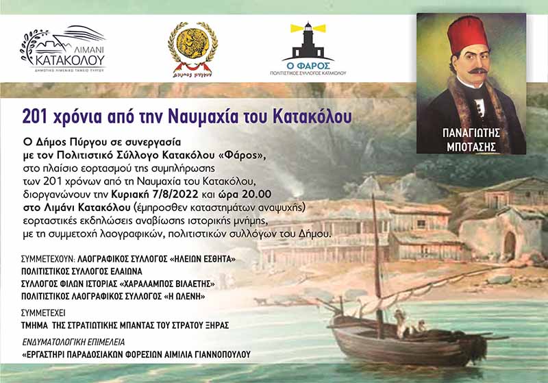Πιστός στις δεσμεύσεις του για την ανάδειξη της τοπικής ιστορίας, ο Δήμος Πύργου σε συνεργασία με τον Πολιτιστικό Σύλλογο Κατακόλου «Φάρος», στο πλαίσιο εορτασμό της συμπλήρωσης των 201 χρόνων από τη Ναυμαχία του Κατακόλου διοργανώνουν την Κυριακή 7/8/2021 και ώρα 20.00 εορταστικές εκδηλώσεις αναβίωσης ιστορικής μνήμης, με τη συμμετοχή λαογραφικών, πολιτιστικών συλλόγων του Δήμου.