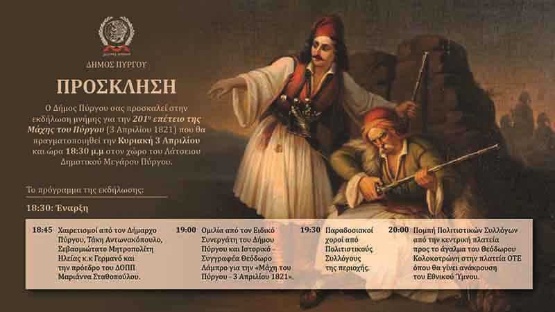 Για δεύτερη χρονιά ο Δήμος Πύργου διοργανώνει εκδήλωση μνήμης και τιμής για την 201η επέτειο της Μάχης του Πύργου (3 Απριλίου 1821). Η εκδήλωση θα πραγματοποιηθεί ανήμερα της επετείου, την Κυριακή 3 Απριλίου 2022 και ώρα 18.30 στον εξωτερικό χώρο του Λάτσειου Δημοτικού Μεγάρου.