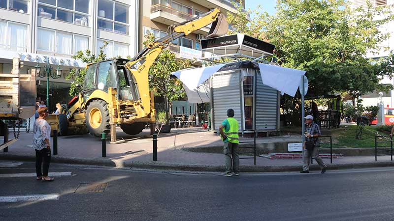 Σήμερα υπό την επίβλεψη της Προϊσταμένης της Πολιτικής Προστασίας κας Κικής Διονυσοπούλου και του προσωπικού της Τεχνικής Υπηρεσίας πραγματοποιήθηκε η απομάκρυνση του κουβουκλίου του περιπτέρου που βρίσκεται στην πλατεία Ηρώων.