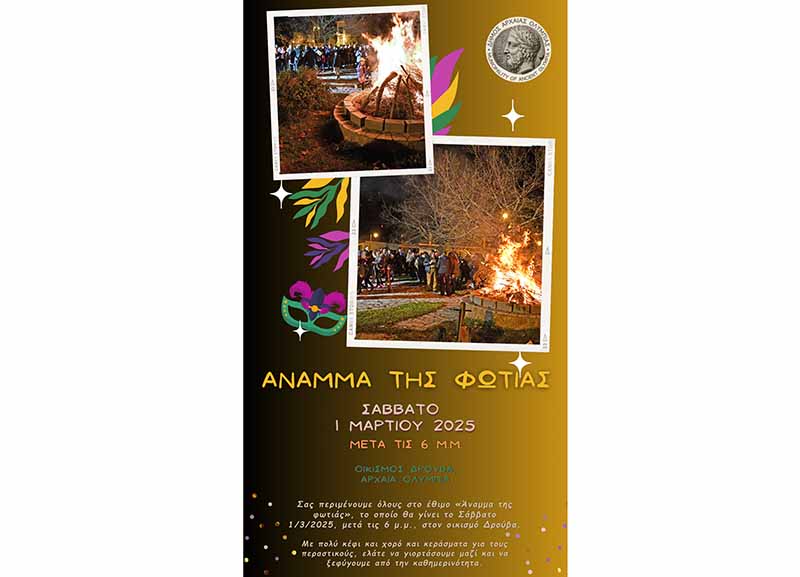 Σας περιμένουμε όλους στο έθιμο «Άναμμα της φωτιάς», το οποίο θα γίνει το Σάββατο 1/3/2025, μετά τις 6 μ.μ., στον οικισμό Δρούβα.