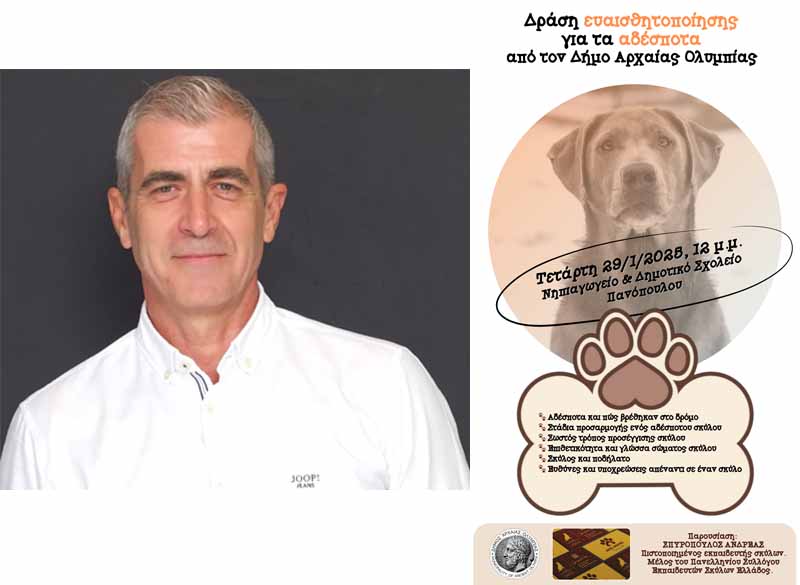 Ο Δήμος Αρχαίας Ολυμπίας, με πρωτοβουλία του αρμόδιου Αντιδημάρχου για τα αδέσποτα ζώα, Δημοσθένη Κατσίκα, συνεχίζει τις ενημερωτικές δράσεις ευαισθητοποίησης των μαθητών για τα αδέσποτα ζώα, στα σχολεία της Πρωτοβάθμιας και Δευτεροβάθμιας Εκπαίδευσης του Δήμου.