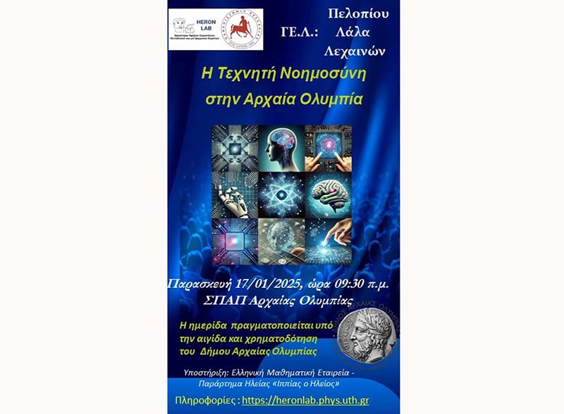 Το ερευνητικό εργαστήριο Υψηλών Συχνοτήτων, Μεταϋλικών και μη Γραμμικών Κυμάτων (HERON LAB) του Τμήματος Φυσικής του Πανεπιστημίου Θεσσαλίας και τα Γενικά Λύκεια Πελοπίου, Λάλα και Λεχαινών, στο πλαίσιο του Μνημονίου Εκπαιδευτικής Συνεργασίας που έχουν συνάψει, διοργανώνουν, υπό την αιγίδα του Δήμου Αρχαίας Ολυμπίας, ημερίδα με θέμα: «Η Τεχνητή Νοημοσύνη στην Αρχαία Ολυμπία», την Παρασκευή 17 Ιανουαρίου 2025, στον χώρο του ΣΠΑΠ Αρχαίας Ολυμπίας.